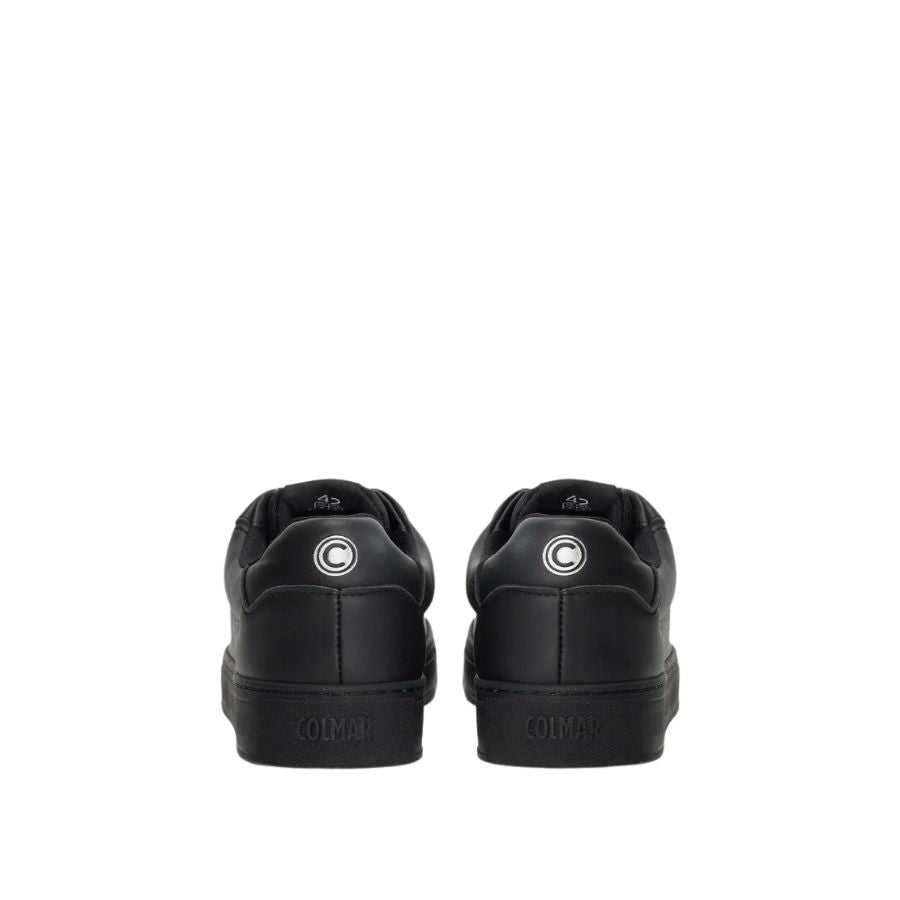 Black low-top Colmar sneakers featuring a matte finish with matching black laces and stitching. Side Colmar logo in raised black lettering. Smooth rounded toe, padded collar, and a full black rubber sole.