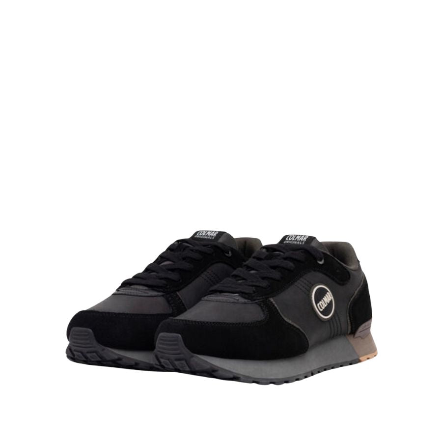 Mens low-top sneakers in black and grey with a mixed-material upper, tonal suede overlays, and the signature round Colmar logo on the side. Designed with a black lace-up front, contrast midsole, and textured rubber outsole.