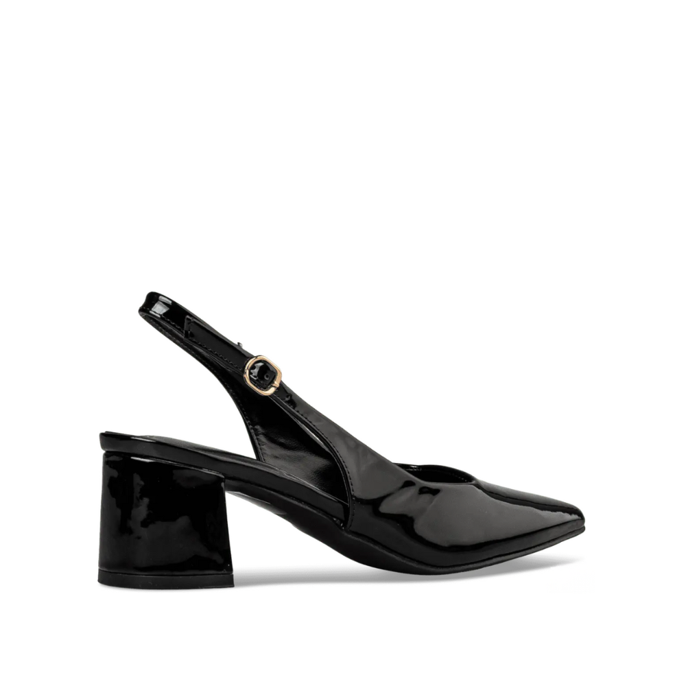 Sleek black patent leather stiletto high heels featuring a pointed toe and glossy finish. designed to elongate the legs and add timeless elegance to any outfit, they are perfect for evening wear, special occasions, or elevating a chic office look.