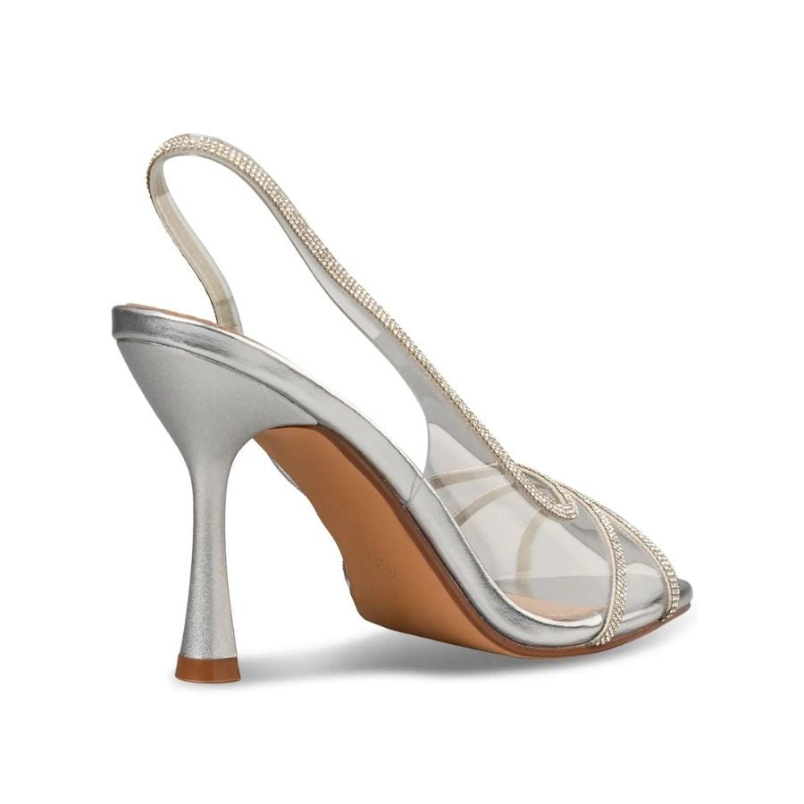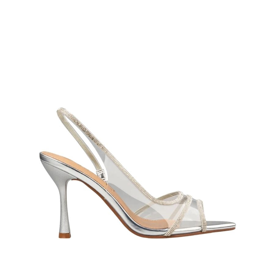 Shine with every step in these elegant ENVIE slingback heels. Designed in a sleek metallic silver finish, this pair features delicate rhinestone-embellished straps that add a glamorous sparkle. The slim slingback strap offers a secure and graceful fit, while the open-toe design enhances femininity and style. Set on a refined heel, these sandals are perfect for special occasions and evening looks.