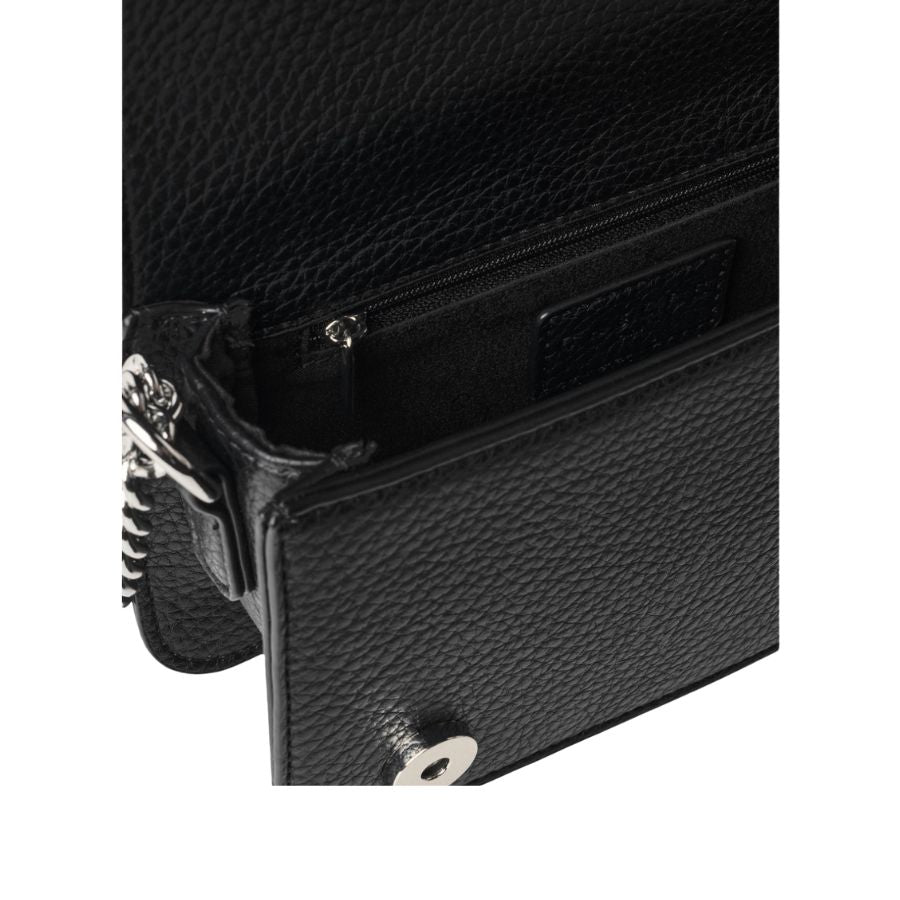 The GAËLLE PARIS studded logo bag adds a bold, modern touch to your style. Crafted from smooth black leather, it features a front logo design adorned with silver studs and a chain-and-leather shoulder strap for adjustable wear.