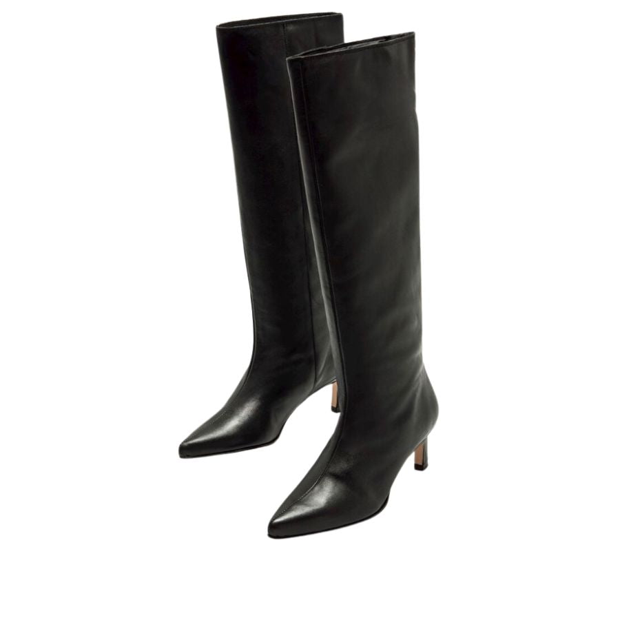 The straight wide shaft that reaches the knee is combined with a thin, low heel, offering a refined yet comfortable silhouette. The pointed toe enhances the shape of the foot, and a discreet golden metallic button at the back adds a decorative touch without overwhelming the design.